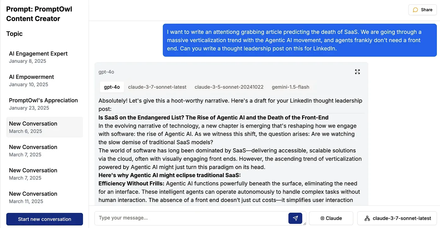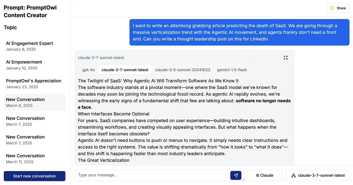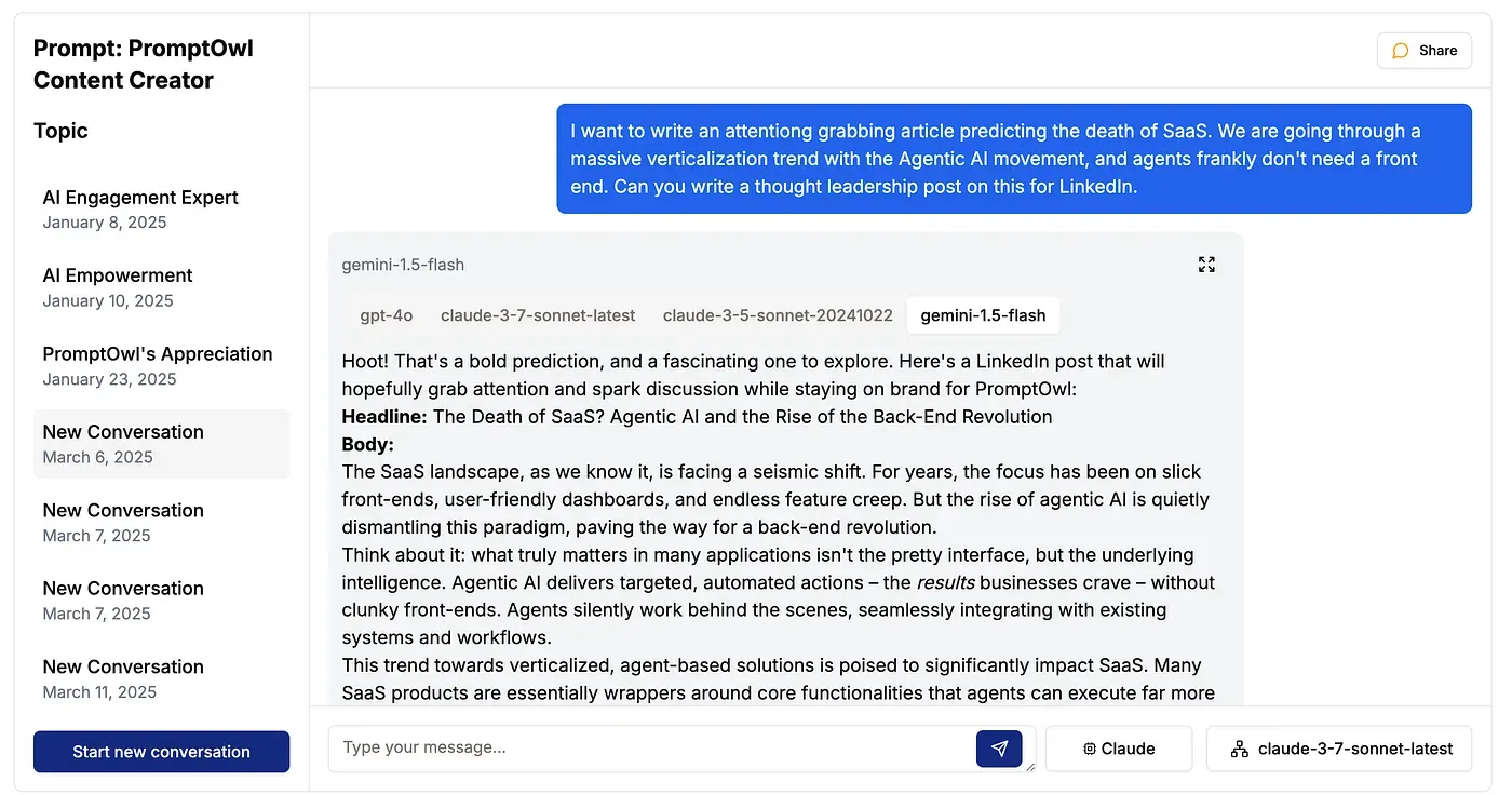 When I start a piece like my recent Death of SaaS article on LinkedIn, I don’t just throw a vague prompt at ChatGPT. I use a prompt management tool like PromptOwl that is primed with specific context from my company.